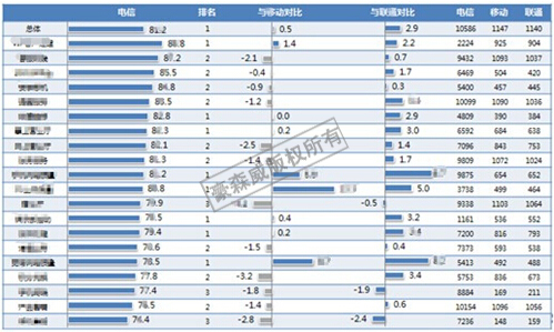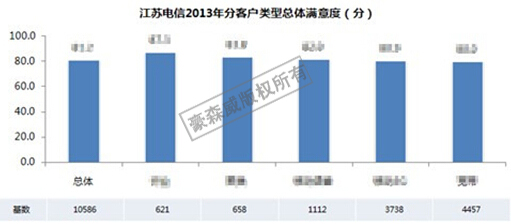 根據(jù)樣本調(diào)查分析,江蘇電信2013年總體滿意度81.2分,較去年稍有下降。其中行業(yè)客戶滿意度最高,寬帶客戶滿意度最低。從地市方面看,滿意度得分較均勻,基本在80分以上。
