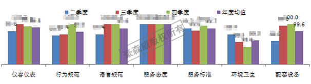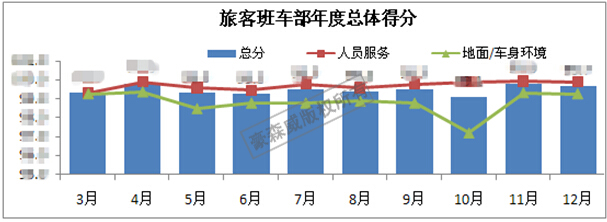 從各項(xiàng)二級(jí)指標(biāo)得分來(lái)看,以旅客班車(chē)部為例,市區(qū)車(chē)車(chē)身的環(huán)境衛(wèi)生是下半年得分下降較為明顯環(huán)節(jié);長(zhǎng)途車(chē)各項(xiàng)得分全年表現(xiàn)較好,但司機(jī)的儀容儀表、行為規(guī)范和車(chē)身的環(huán)境衛(wèi)生和配套設(shè)施得分起伏較大。