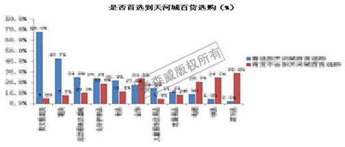 本期顧客對天河城百貨的忠臣度有所提高,顧客的下半年的到店頻率比上半年的到店頻率明顯比上半年有所增加。豪森威認(rèn)為,下半年的到店頻率比上半年高,一方面可能由于下半年經(jīng)濟(jì)環(huán)境向好,商場促銷活動增多,消費(fèi)者購物的熱情更高,另一方面看出天河城百貨在2013年下半年的服務(wù)改善得到了顧客的認(rèn)可。調(diào)查中有68.0%的顧客表示當(dāng)需要選購男女服裝時,會首選到天河城百貨進(jìn)行選購,另外鞋類占比也達(dá)到42.7%;運(yùn)動服飾器械、化妝護(hù)膚品以及食品緊隨其后,這表明天河城百貨這些商品的質(zhì)量、性價比及豐富度較好。而表示肯定不會到天河城百貨選購電器、鐘表、滋補(bǔ)品、金飾等類商品的顧客比例較高,建議天河城百貨應(yīng)加大在這些種類商品上的投入工作。