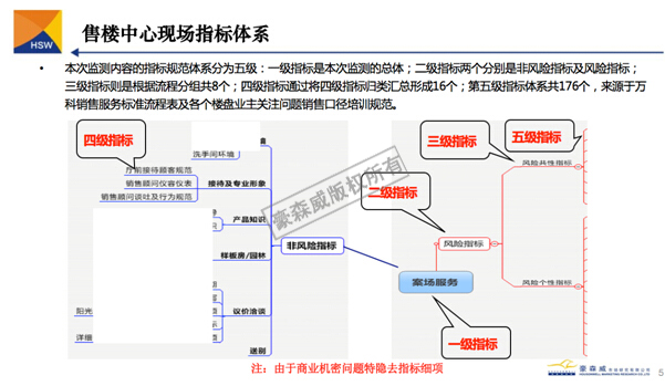 整個滿意度常態(tài)化監(jiān)察體系基于深挖客戶需求和心理感知,解構(gòu)客戶觸點(diǎn),構(gòu)建銷售邏輯與完善銷售流程:從客戶第一次進(jìn)入銷售案場,客戶的觸點(diǎn)由環(huán)境、物管服務(wù),案場服務(wù),情景體驗(yàn),后續(xù)服務(wù)五個環(huán)節(jié)組成。下為案場合服務(wù)涉及到2個二級指標(biāo)、8個三級指標(biāo)、16個四級指標(biāo)及176個五級指標(biāo);