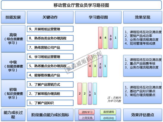 在運(yùn)營商競爭日益激烈的今天,營業(yè)廳是最重要的客戶觸點(diǎn),但是因?yàn)橐幌盗性驅(qū)е乱痪€營業(yè)員流失率較高。如何保障營業(yè)廳新進(jìn)營業(yè)員能夠迅速勝任保障客戶體驗(yàn),一套行之有效的人才培養(yǎng)體系顯得非常重要。學(xué)習(xí)路徑圖的方法論,正是基于“快速提升勝任力以達(dá)成績效”的理念,通過提供一個(gè)結(jié)構(gòu)化的學(xué)習(xí)方案,提升員工學(xué)習(xí)的效率,使其以最快的速度提升能力,從而盡快盡早地勝任工作任務(wù),為營業(yè)廳創(chuàng)造價(jià)值。