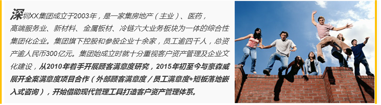 早在2015年初,XX集團(tuán)決策層借腦引智,正式與廣州市豪森威有限公司展開合作,通過(guò)多次深度溝通以及對(duì)前期滿意度調(diào)研工作的梳理,確認(rèn)了滿意度全案工作的開展細(xì)則,建立了由外至內(nèi)的集團(tuán)品牌之客戶資產(chǎn)管理邏輯,針對(duì)不同產(chǎn)業(yè)版塊及職能崗位設(shè)計(jì)了近70份問卷,深訪數(shù)量自下而上覆蓋了所有的管理崗。通過(guò)滿意度的測(cè)量鎖定了一系列的管理短板及優(yōu)先改進(jìn)次序,其中員工滿意度測(cè)量中的“組織氛圍”改造成為重中之重。
